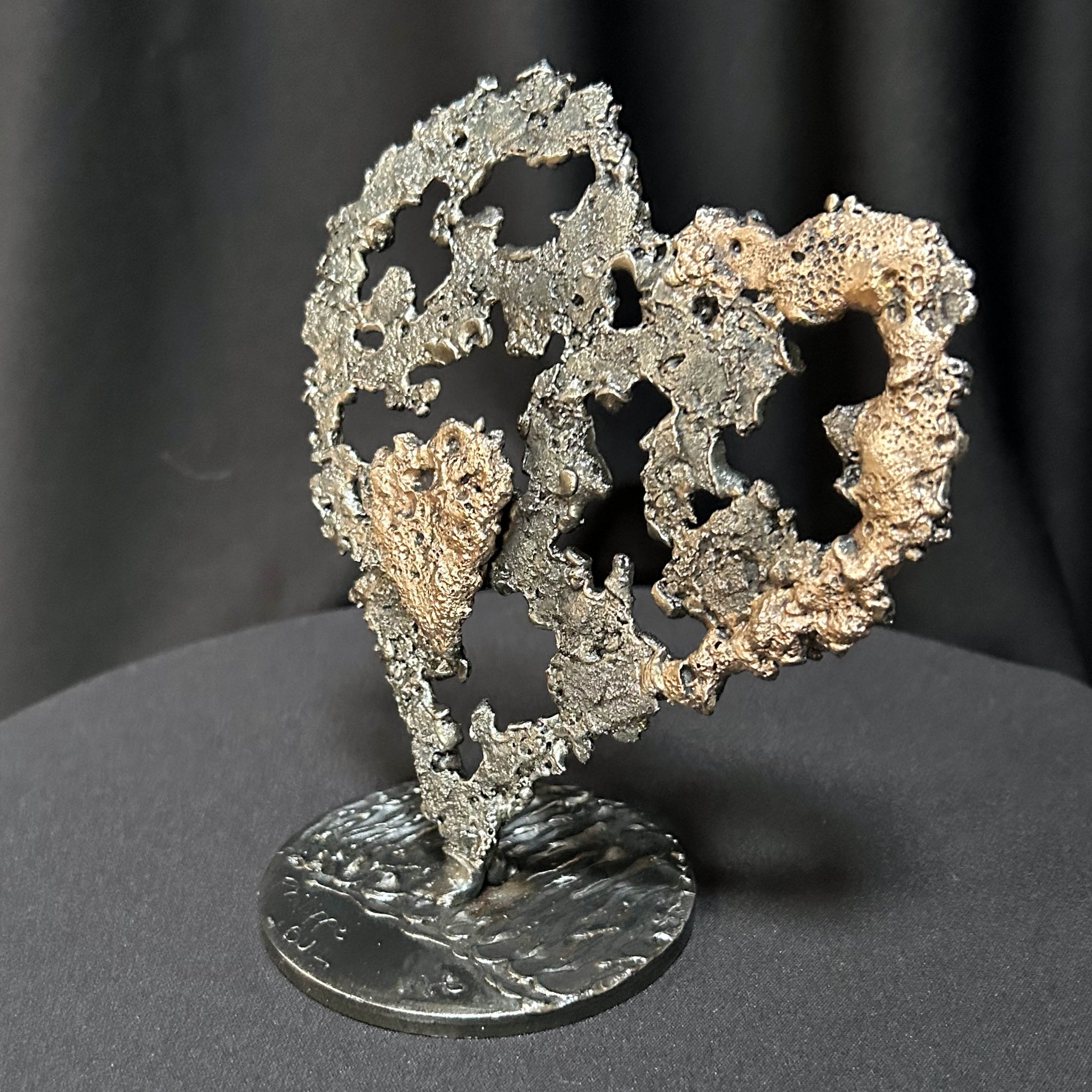 Cette sculpture représente un cœur stylisé en acier, dont la structure ajourée évoque la fragilité et la complexité des sentiments. L'aspect brut et texturé de l'acier est rehaussé par des touches de bronze qui semblent s'infuser dans la matière.