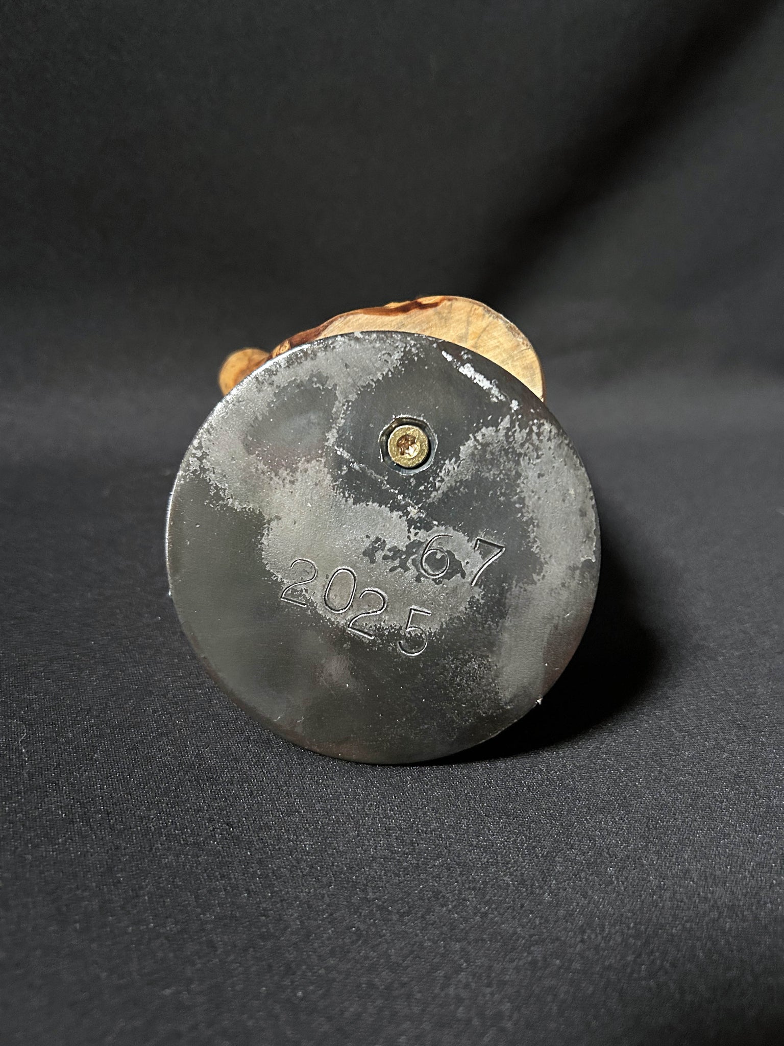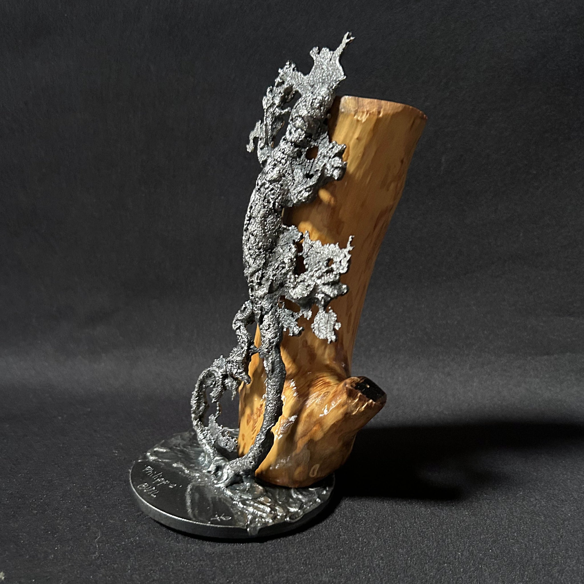 Auf einem Metallsockel befestigt und an ein Fragment aus natürlichem Holz gelehnt, verkörpert der Salamander die Begegnung zwischen rohem Material und präziser Handwerkskunst. Als uraltes Symbol für Transformation, Widerstandskraft und Wiedergeburt scheint er hier zwischen Stärke und Zerbrechlichkeit, Bewegung und Gleichgewicht zu schweben.