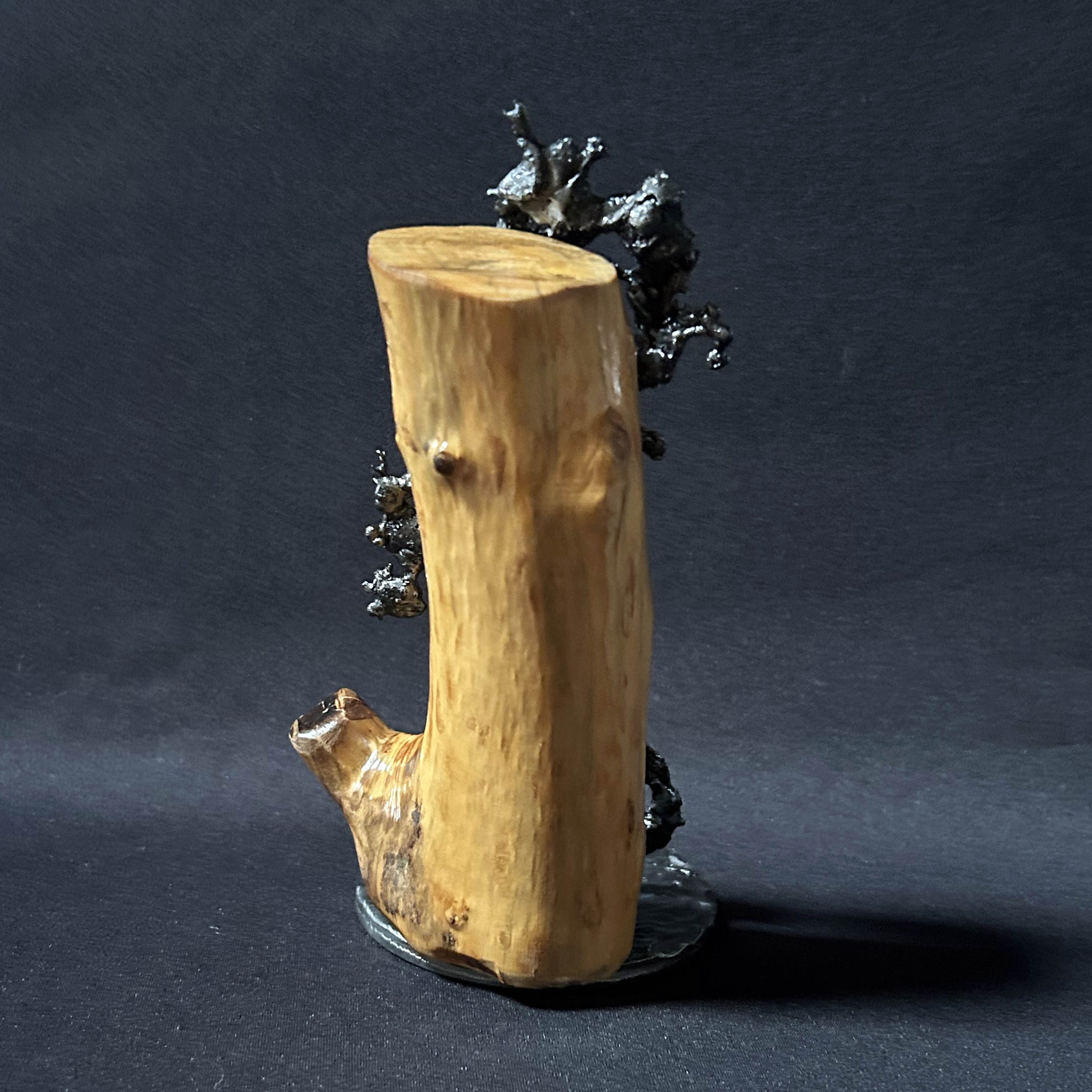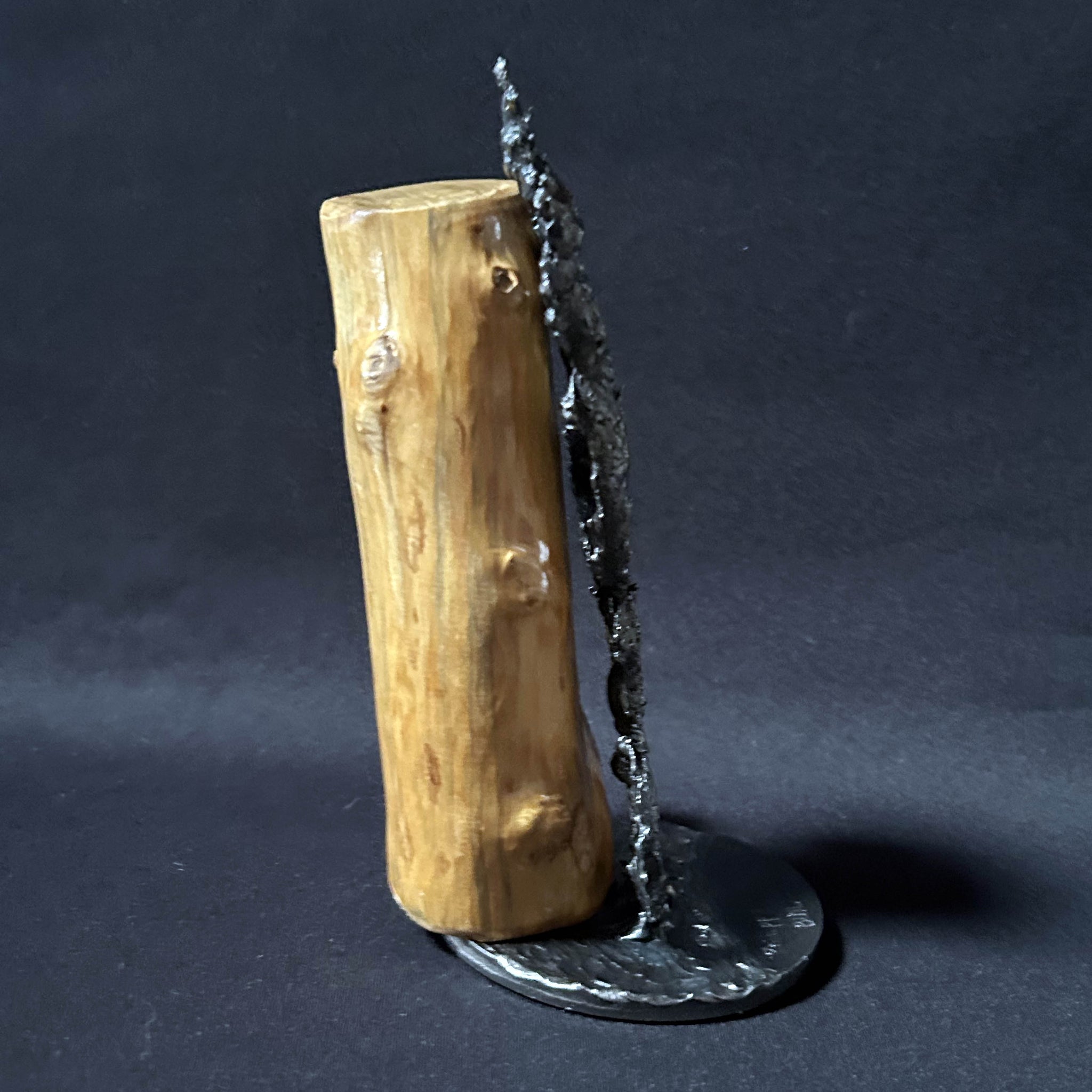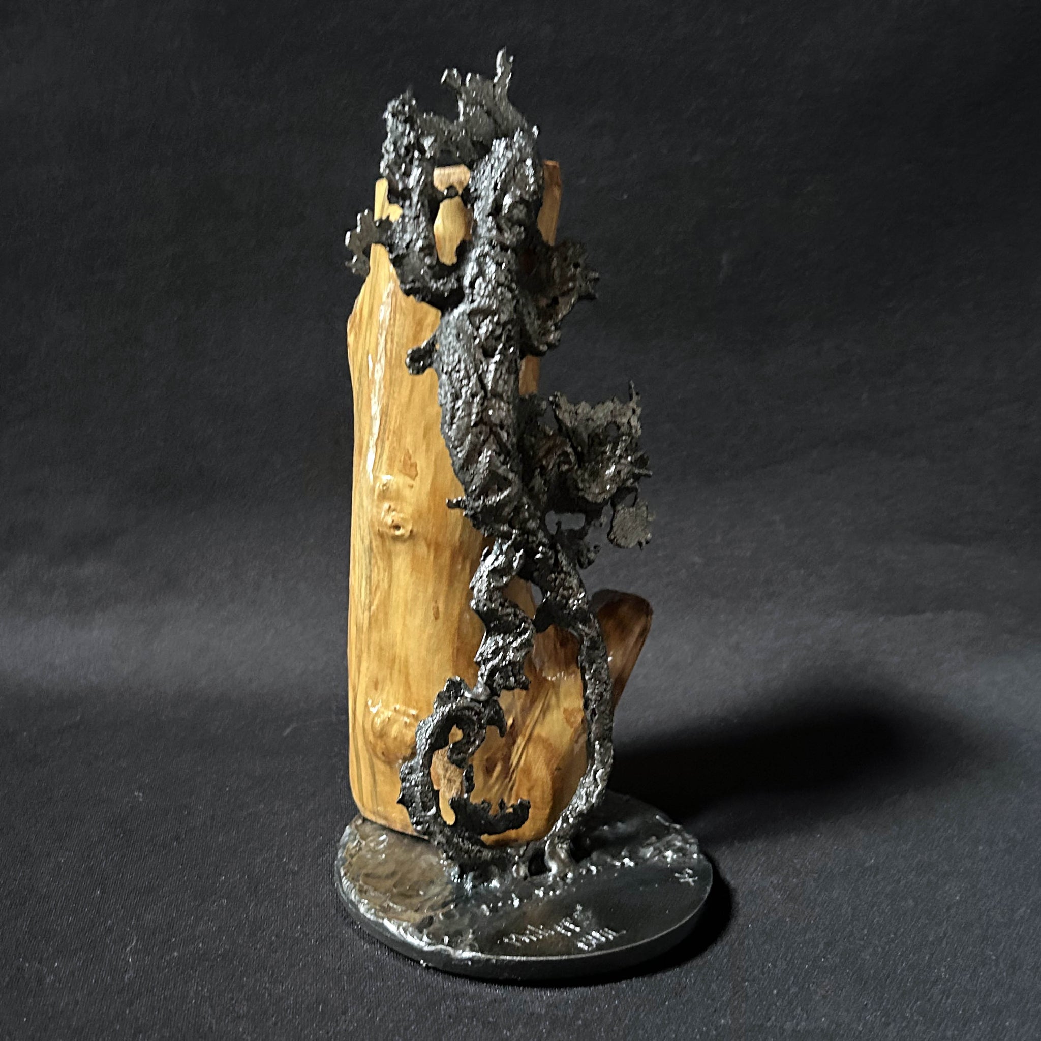 Diese Skulptur zeigt einen Salamander, der scheinbar geschickt auf einem natürlichen Holzträger klettert und einen eindrucksvollen Kontrast zwischen der Wärme des organischen Materials und der industriellen Kälte des Stahls schafft.