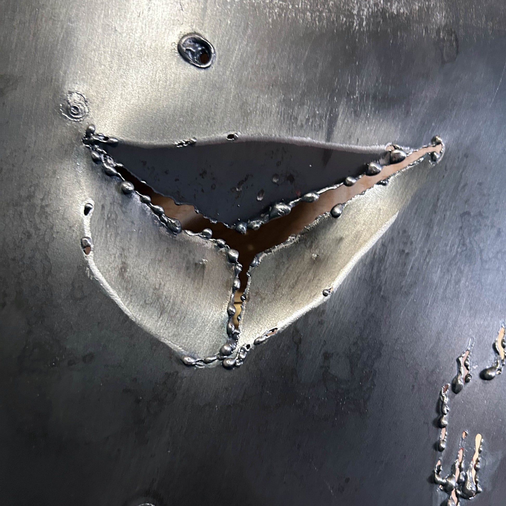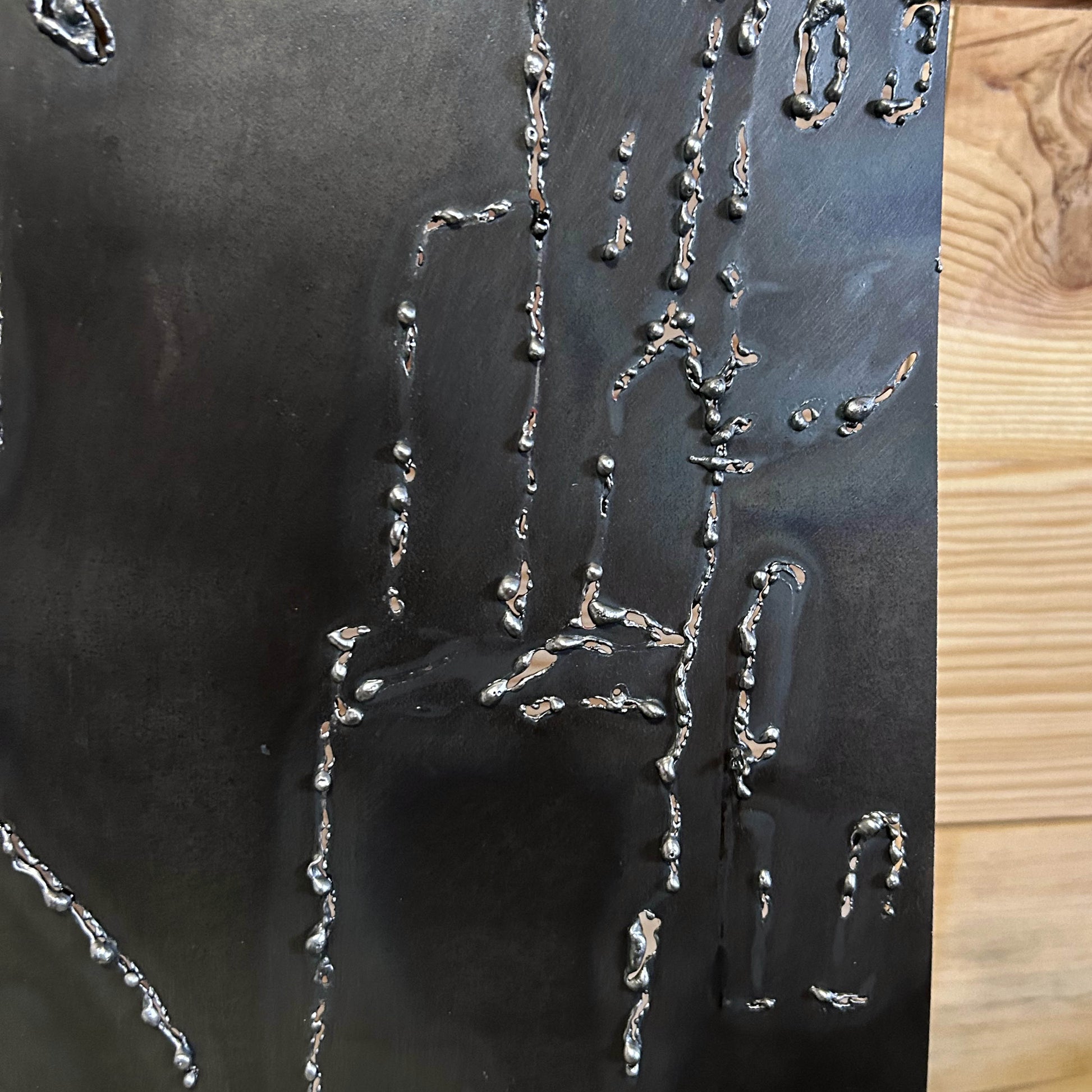 Le fond texturé et les volumes accentués offrent une présence sculpturale, mêlant force du métal et sensibilité du geste artistique.