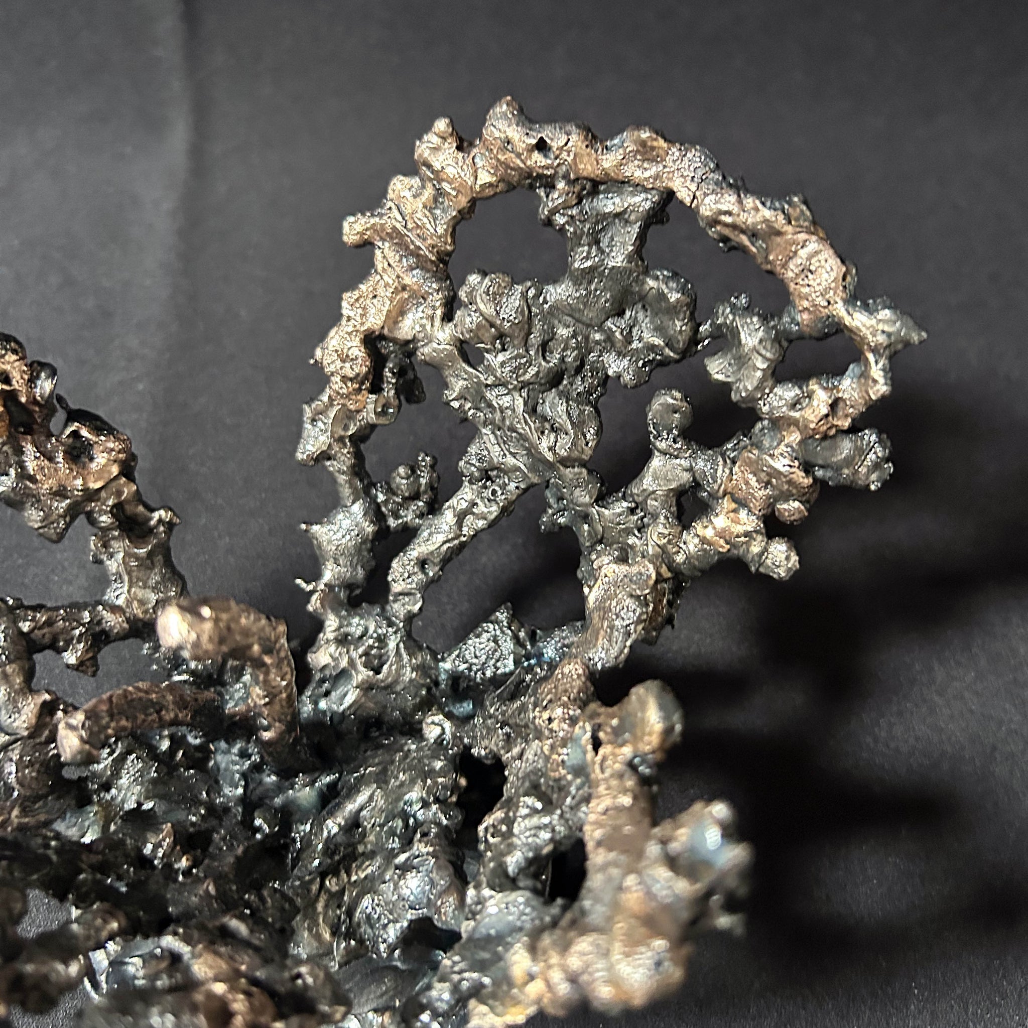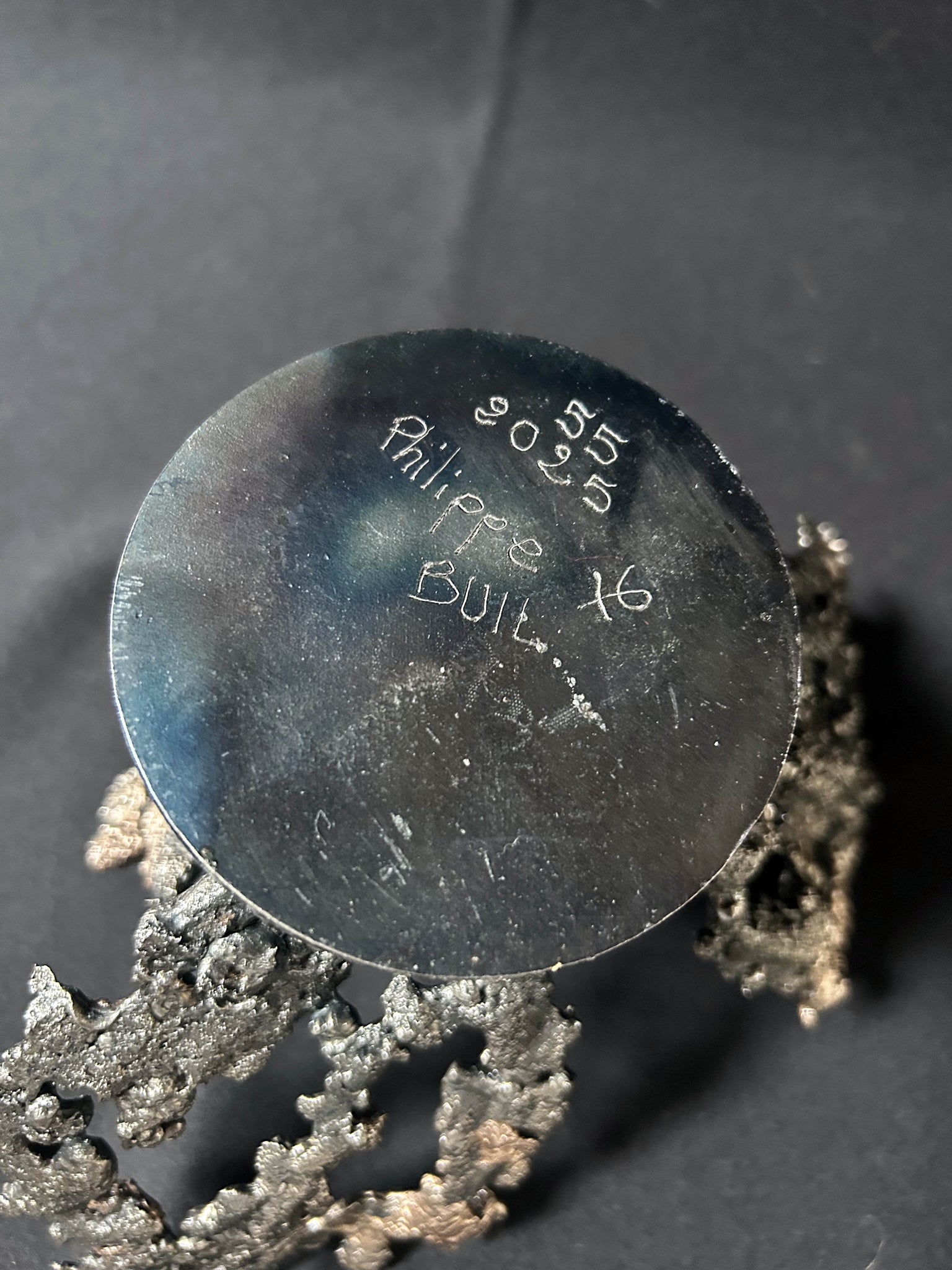 这件独特的金属蕾丝作品捕捉了盛开花朵的细腻与力量。 由钢和青铜的微妙混合雕刻而成,唤起了自然的脆弱性与金属的坚固性的对比。每一片花瓣似乎在光线的作用下展开,展现出纹理和反光的变化,使雕塑既富有诗意又充满力量感。直径 8 cm 的钢制底座独一无二的作品。雕塑签名,并附有其真实性证书。高度 10 cm - 宽度 19 cm - 深度 14 cm