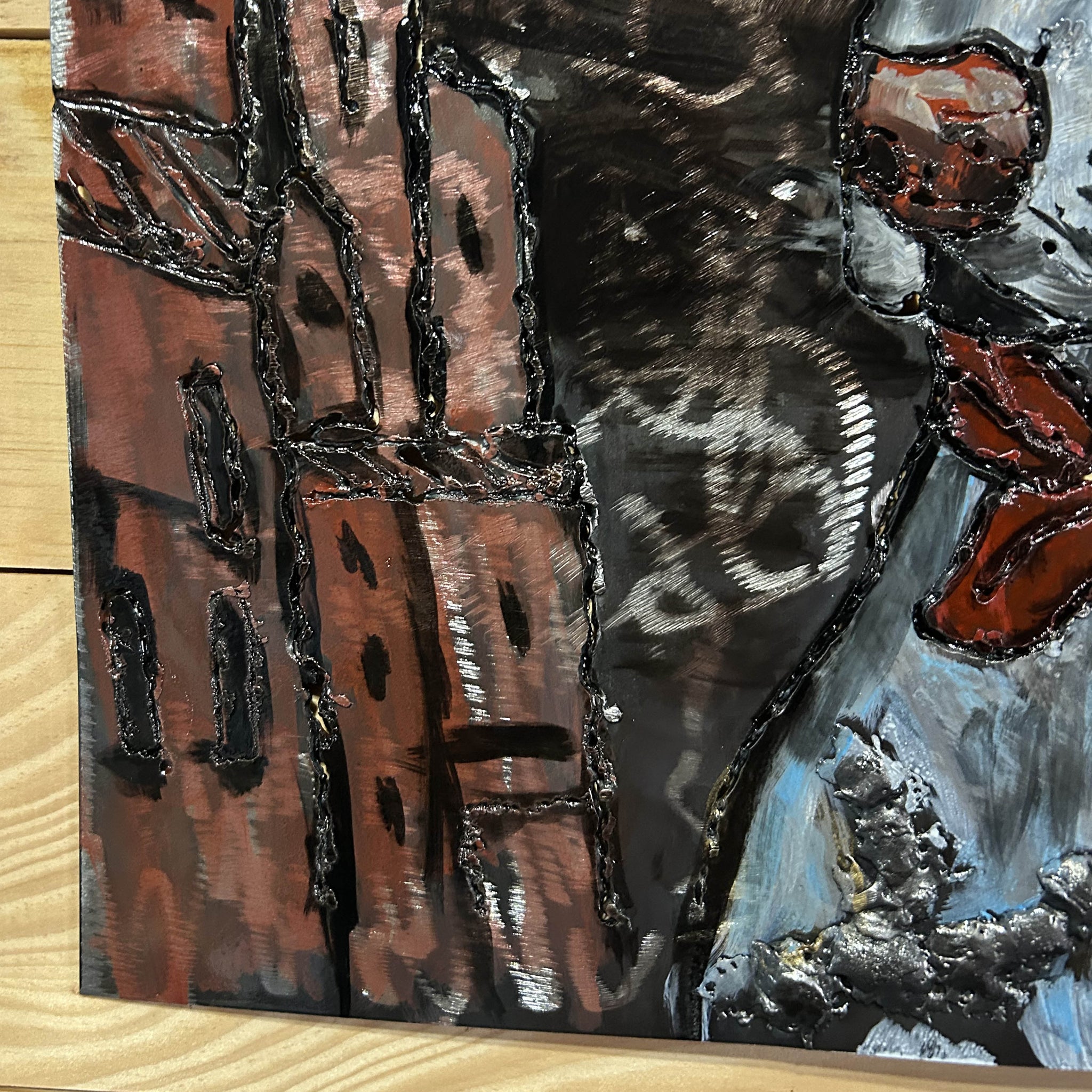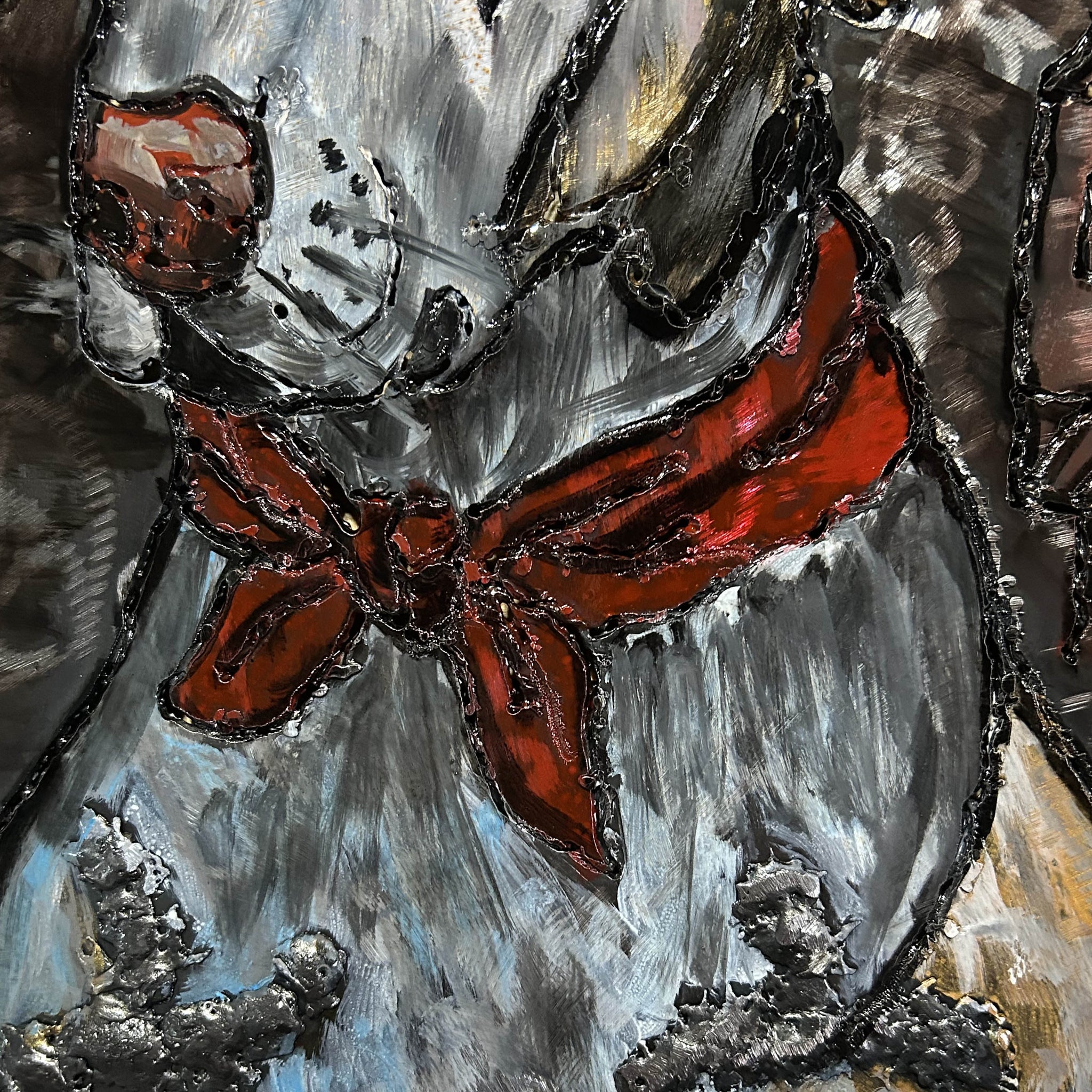 画作赋予了一只佩戴巴斯克围巾和贝雷帽的狗生命,通过融合金属塑形和富有表现力的色彩颜料创作而成。