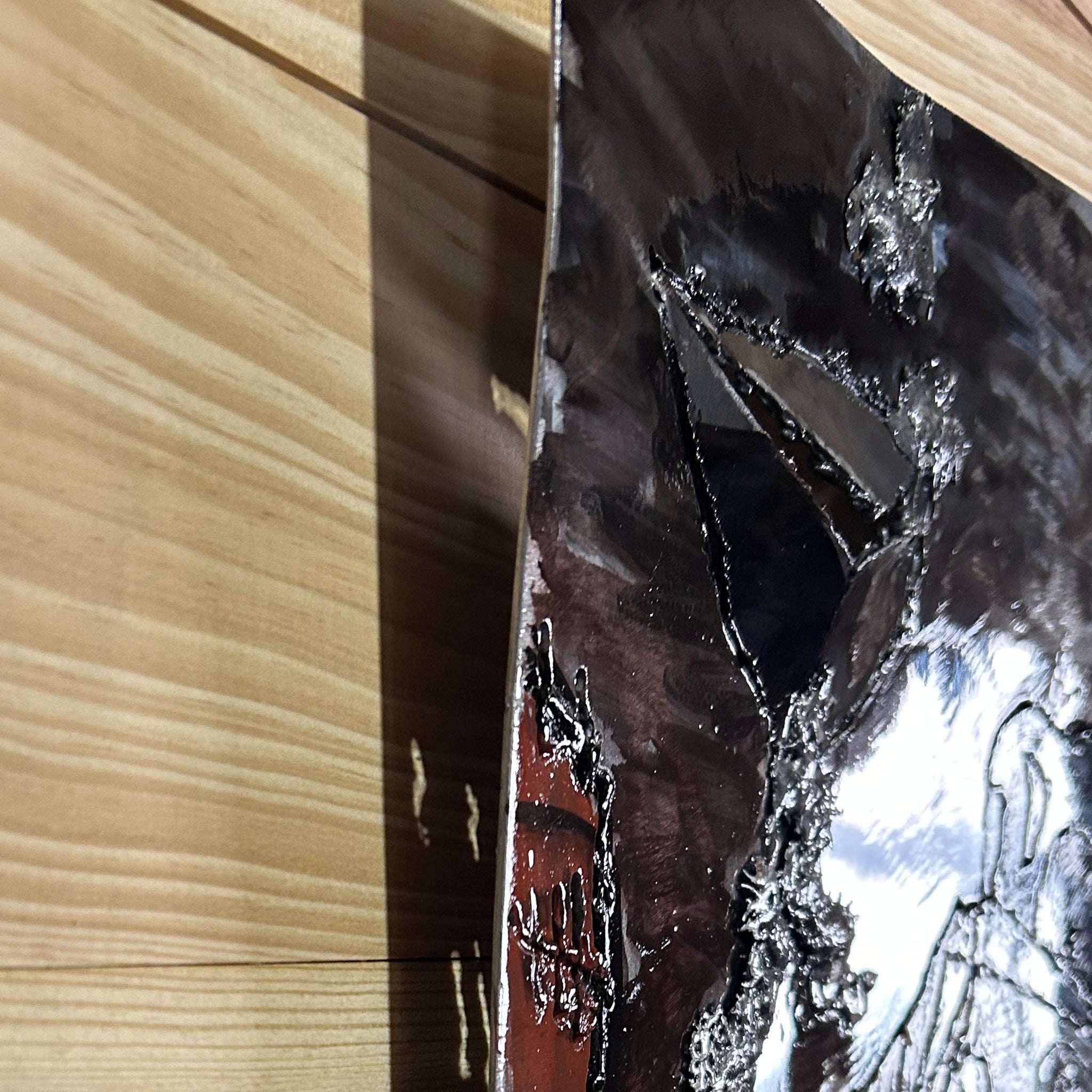 纹理背景和突出的体积营造出雕塑感,融合了金属的力量与艺术动作的细腻。