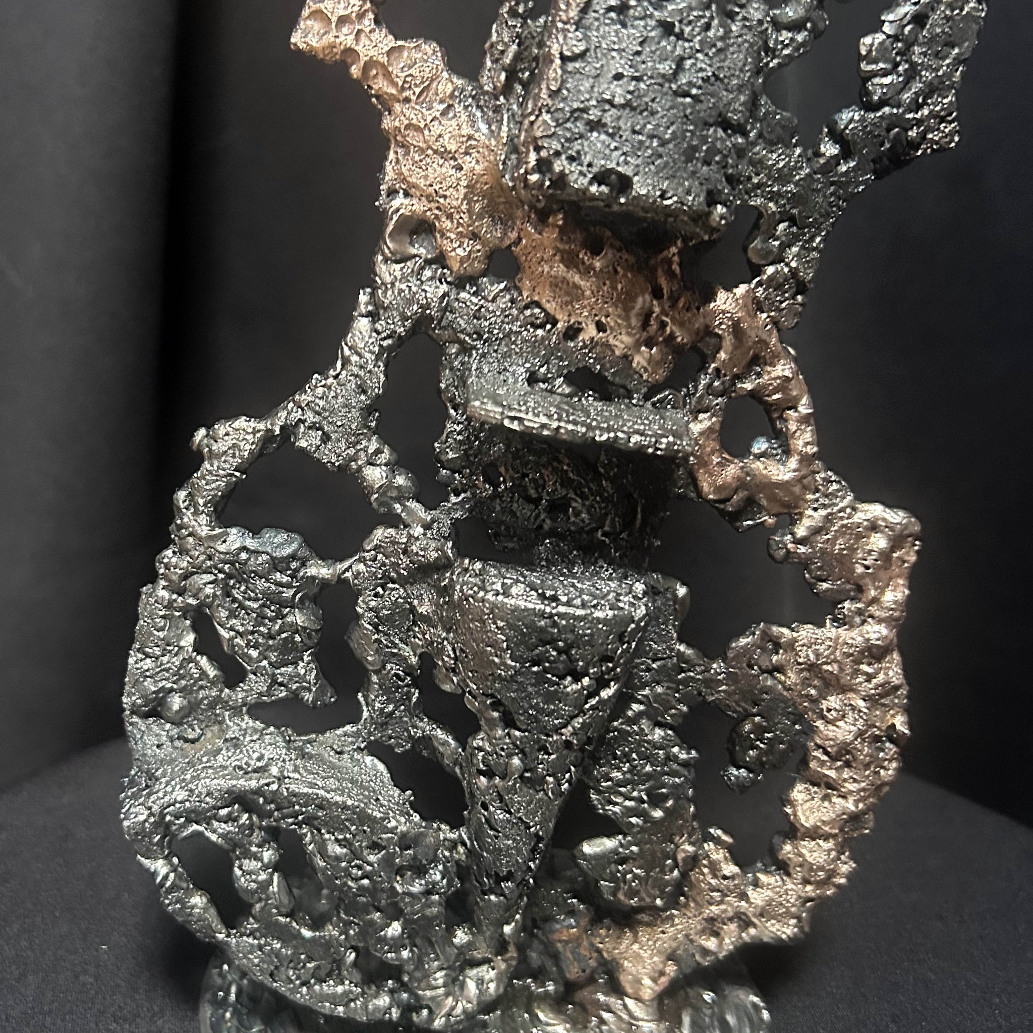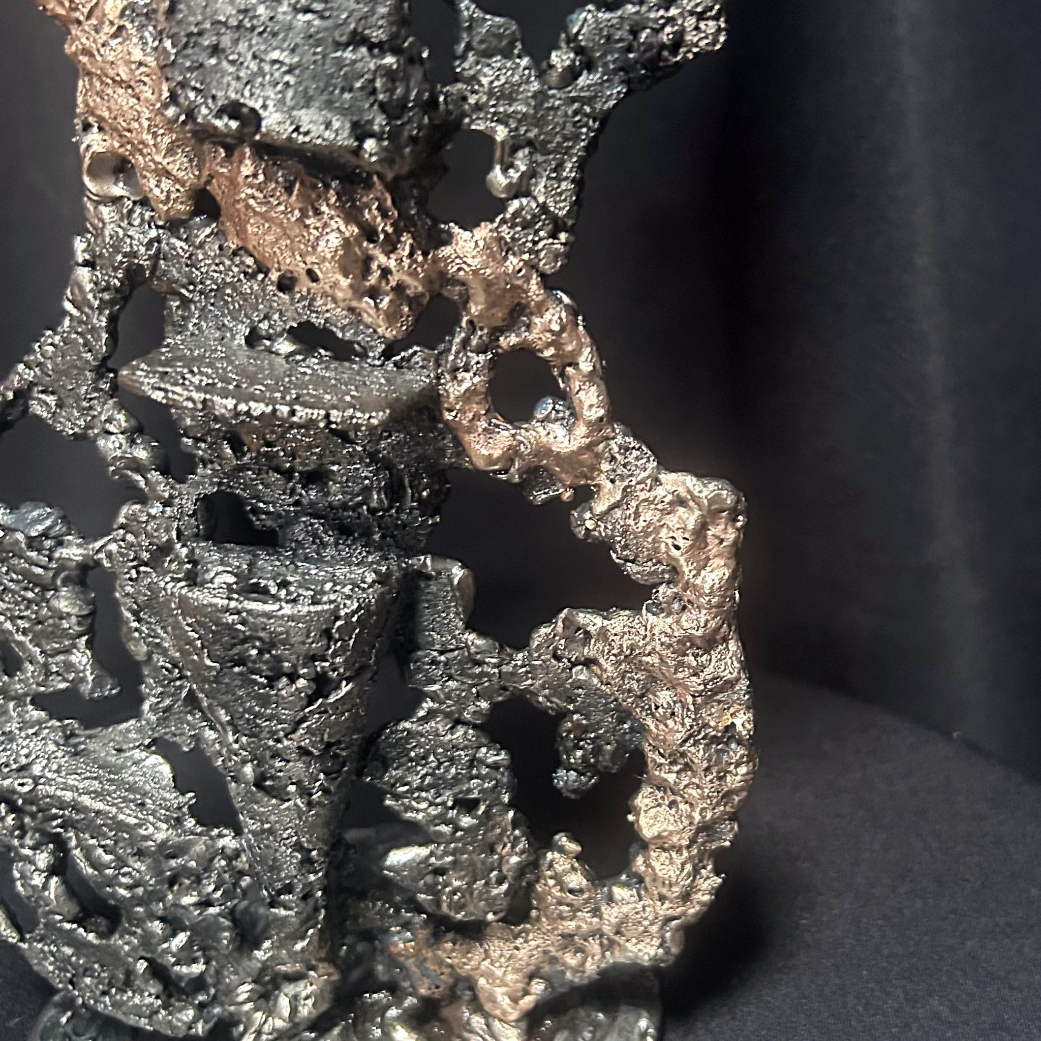 金属不是无生命的材料,它会振动,会记忆,这件雕塑体现了这一哲学。它通过一种几乎有机的镂空材质探索声音的无形运动。